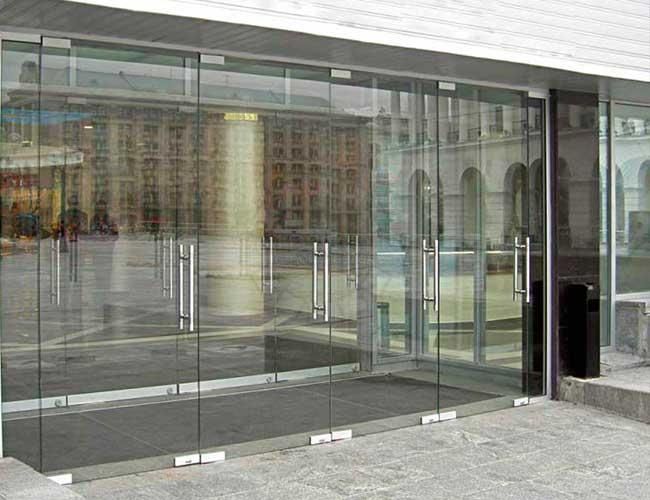 Противопожарная безрамная дверь со стеклом в торговый центр в Пушкино